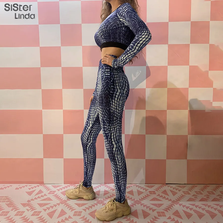New Sisterlinda Fashion Print Fitness Sportswear Women Long Sleeve Crop Tops T-shirt Sport Leggings Pants Two Picse Set Tracksuit